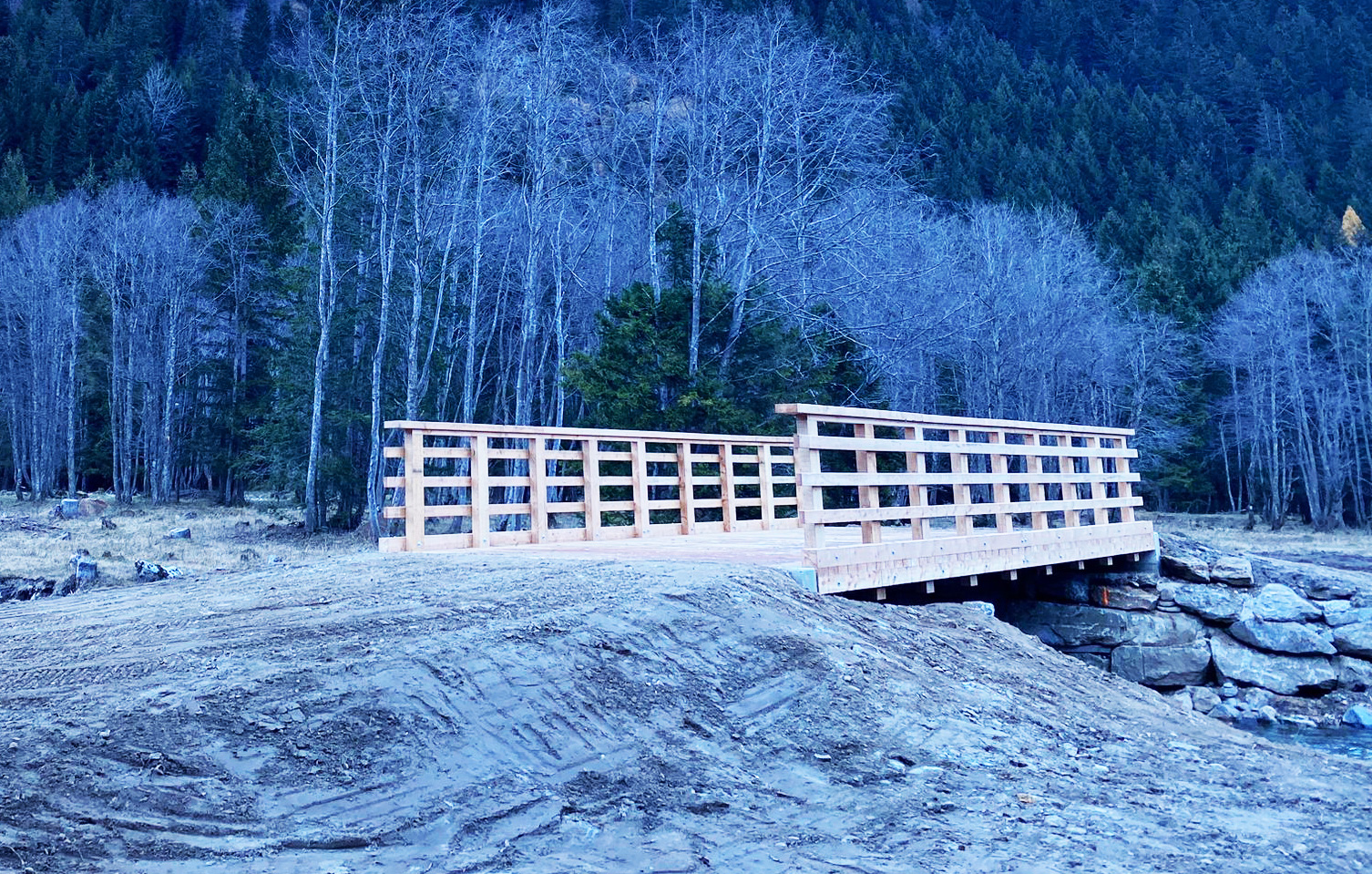 Molto apprezzata è stata la collaborazione della Protezione civile Biasca e Valli, che ha messo a disposizione un gruppo di militi durante un’intera settimana. Per la messa in opera della struttura portante è stata chiesta la collaborazione della ditta Bianchi Davide Sagl di Olivone, specializzata in opere di genio civile. La struttura visibile in legno è stata realizzata dalla ditta Maestrani e Morosi Sagl di Dangio. Per un armonioso inserimento del ponte nell’ambiente è stato utilizzato del legno di larice proveniente dalla regione (bosco di Castel Curterio a Torre). La progettazione di ingegneria civile è stata generosamente offerta dalla ditta Küngvilla di Biasca.